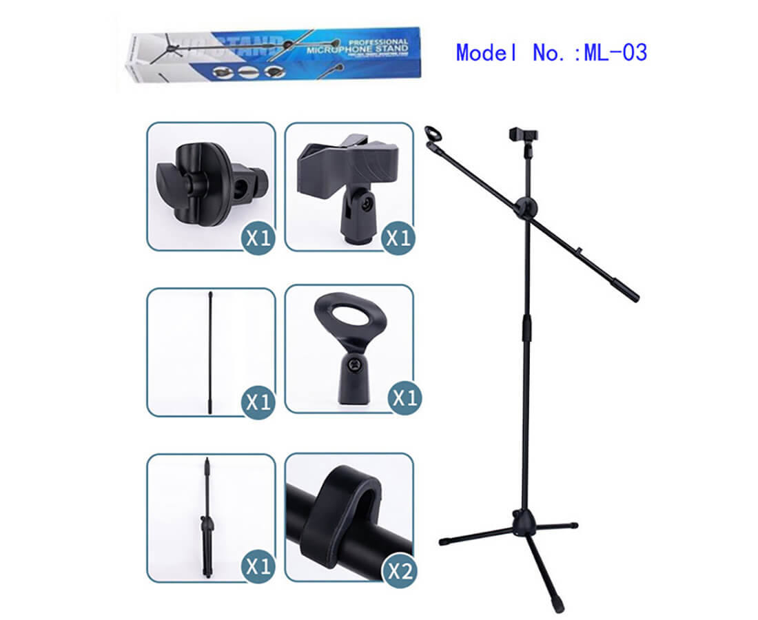 产品名称:专业麦克风支架,三脚,两条管配两个咪夹,适用于舞台。材料:管体:金属,连接器和咪夹:塑料主杆高度可调:75-150cm水平杆长度:75cm彩盒包装